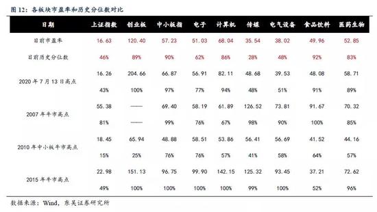 在讨论完市场情绪指标之后,在估值分布的第二部分,我们选择了估值历史分位数和风险溢价等高频估值指标与过往牛市时期进行对比,探寻目前所处在的位置。