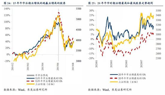 从净利润同比增速的角度来看,仅在2015年牛市末期之际业绩最低的公司跑赢了业绩最高的公司,本轮牛市中业绩最低股票的行情还未出现。本轮牛市归母净利润同比增速最高的10%和归母净利润同比增速排名最低的10%在走势上较为同步,但排名靠后的公司涨幅却低于业绩排名靠前的公司;在2015年牛市时期,自2015年5月中下旬起,净利润同比增速排名后10%的股票涨幅开始跑赢业绩排名前10%的股票。其余牛市时期都没有出现净利润同比增速排名最低的10%跑赢前最高的10%的现象。我们认为在本轮牛市之中,受到海内外疫情影响,业绩最好的公司其短期业绩动能比业绩最差的公司要更强,因此出现分化。