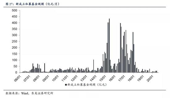 2020年七月新成立股票型私募基金规模为1亿元,前值12亿元。在2015年牛市期间,2015/6的私募发行规模达到了433.6亿元的顶点;而在07年牛市时期,新发私募基金规模的顶点则是在牛市结束之后的2007/11达到了70.46亿元的月度高点。