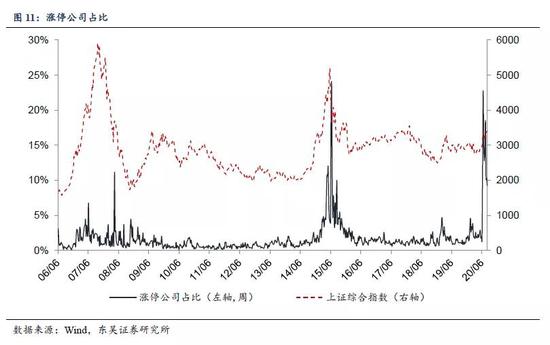 涨停公司占比的高点更易发生在牛市结束之后:最近一周涨停股票占比9.3% ,在7月中旬顶点时期涨停公司的占比达到了22.74%;2015年牛市时期,涨停公司占比的高点发生在牛市见顶之后2015/7/10(周度)的23.9%,牛市见顶前涨停公司的高点则是在2015/5/29(周度)达到11.91%;2007年牛市时期,涨停公司占比的高点在2008/5/9的11.1%,牛市见顶前的顶点发生在2007/6/29的6.77%。过往牛市更易在下跌趋势反弹之中出现更为显著的涨停潮。
