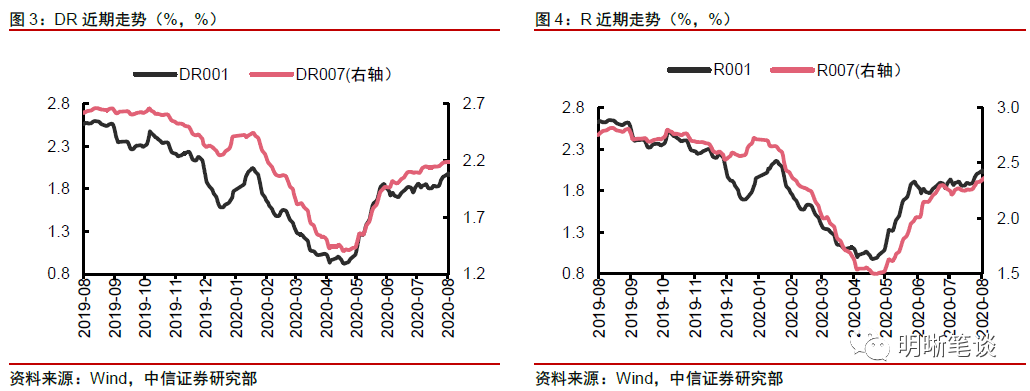 压降结构性存款的要求使得流动性结构分层,这也是近期利率上行的主因。从结构上看,中小银行和非银金融机构的流动性边际趋紧。城、农商行的同业存单发行利率不断走高,尤其是城商行负债压力犹大,9月3日1年期同业存单融资成本已经高出1年期MLF利率40bps左右。在中小行资金偏紧的情况下,非银金融机构也感受到了明显的资金压力,近期资金利率不断走高,R007近期高点接近2.6%, 即便是近20个交易日的均值也达到2.31%,持续超过2.2%的7天逆回购利率。