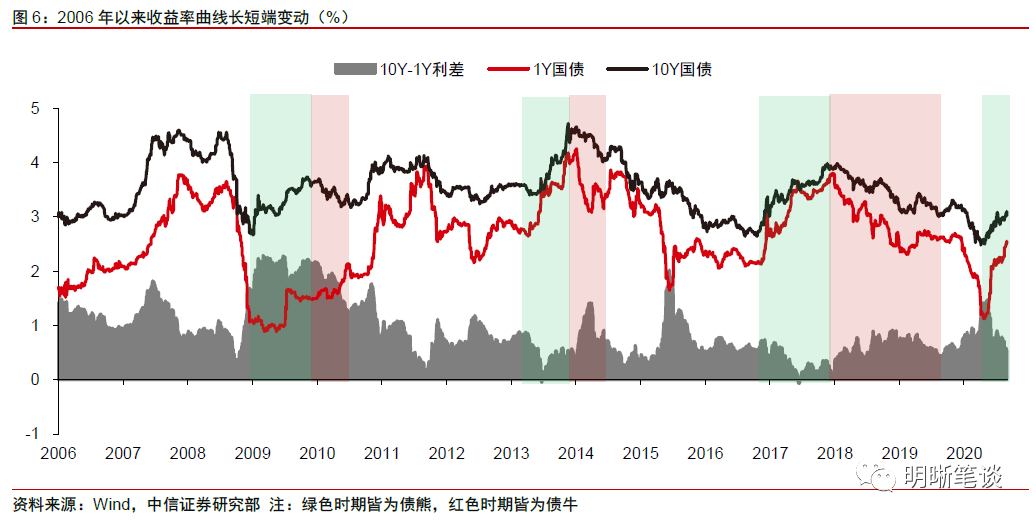 历史上看,2020年与2009年的相似之处更多。从经济基本面看,两个年份经济都遭遇了不小的冲击,国内经济恢复相对较快,一年之内基本能够恢复潜在增速偏弱一点的水平,而全球经济则修复缓慢。政策层面看,09年宽松的货币政策+“四万亿”计划,2020年宽松的货币政策+广义政府赤字扩张(今年力度小于09年),地产政策都是边际收紧的。相比之下,2013年的“钱荒”和2016年底开始的“金融去杠杆”都是监管大幅加码导致的,伴随着短端大幅冲高,贴近长端,收益率曲线走出非常极致的熊平。而今年监管发力的峰值已经过去,短端和长端利率之间目前保持着中性的水平。如果央行能够采取降准或继续超额投放MLF成功缓和资金面的结构性压力,那么这一轮熊平就可能已经接近尾声。
