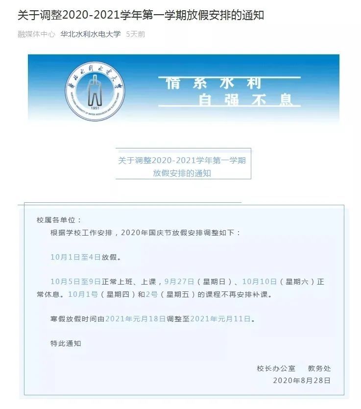 据华北水利水电大学发布的调整放假安排的通知,该校国庆假期放假4天,寒假放假时间提前7天。
