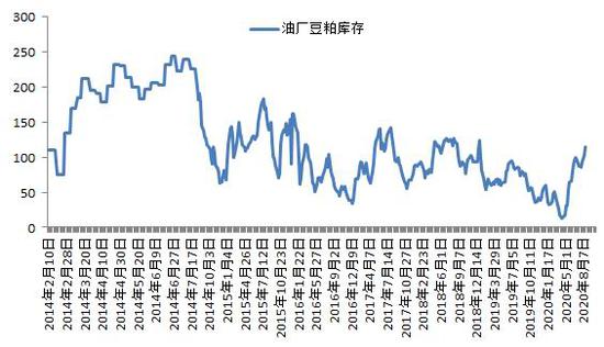 从国内油厂开机情况来看,截至2020年8月21日当周,国内主流油厂的开工率仍处于61%的历史高位水平。从历史规律来看,虽然目前国内油厂开工率距离2010年10月份的超过70%以上的开工率仍有10个百分点的差距,但与正常年份相比,已经处于绝对高位水平。9月份油厂开工率难有下降,仍将保持高位,继续攀升的空间已经十分有限。油厂豆粕库存压力有待化解,这将制约豆粕其均价整体上行空间。油厂豆粕胀库压力是否会持续增加将主要取决于来自于市场需求的承接力度和备货节奏。