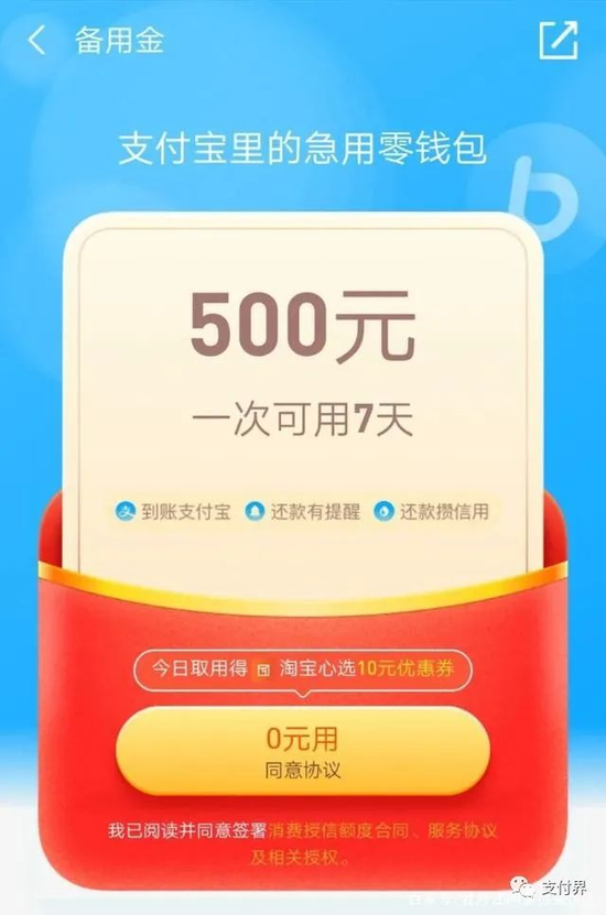 所谓的支付宝备用金其实原理上和蚂蚁借呗是一样的,都是小额短期借款产品,最大的区别是额度不同,备用金一般是500元的额度,7天自动归还。