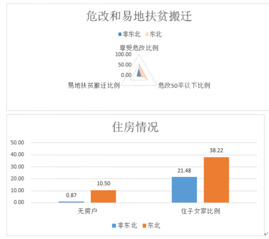 最后我们再看看几组脱贫攻坚的调研数据。通过这几张脱贫攻坚数据分析图,我们发现其异地搬迁户比例比较低,说明当地生产生活环境可能较好,不过其危改比例较高,且和子女同住比例较高,说明这里的农户倾向于与和子女同住,家庭氛围和谐,但住房陈旧。