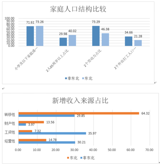 此外,进一步对家庭人口结构分析图和收入来源分析图进行分析,发现该地区人口老龄化较为严重,且转移收入占比比较高。