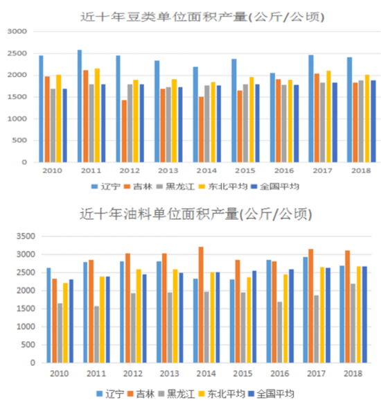 首先我们来看看小麦、玉米、豆类、油料市场农产品的单位面积产量的分析图。从图中我们可以看到,东北平均小麦单产低于全国平均水平,玉米单产高于全国平均水平,豆类单产略高于全国平均水平,油料单产则基本与全国平均水平持平。