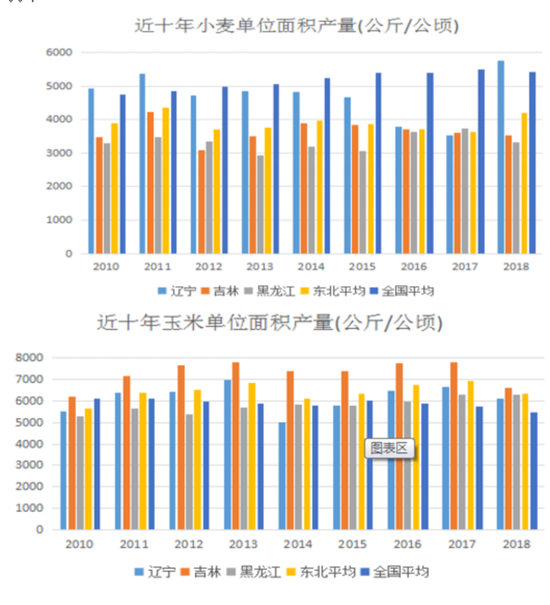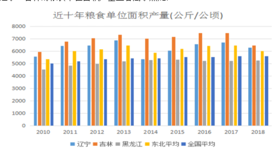 从分析图中可以得到,东北平均粮食单位面积产量高于全国平均水平,其中辽宁、吉林的粮食单位面积产量显著高于黑龙江。