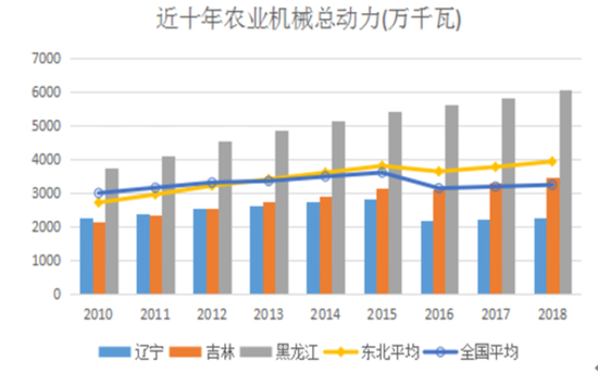 从该分析图可知,2013年以前东北平均农业机械总动力低于全国平均水平,但2015年以后,机械化水平显著高于全国平均水平,并且呈扩大趋势,说明东北农业机械化水平在不断提高。