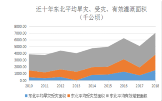 其次,再来看看自然灾害和有效灌溉面积分析图,从受灾面积看,旱灾是东北近10年面临的主要自然灾害,并且还有扩大的趋势,而全国旱灾面积则呈现下降趋势。