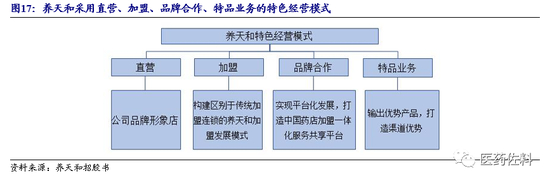 养天和:直营、加盟、品牌合作、特品业务渐进发展。自成立之初,养天和在行业内首先提出了“统一品牌形象,统一运营模式,统一采购配送,统一资金管理,统一人事管理,统一商品价格”的加盟管理模式。通过多年深耕加盟连锁市场,结合行业发展趋势和规范性要求,形成了具有养天和特色的“七统一”、“1+3”民主管理机制等加盟管理体系,区别于传统药店以直营连锁为主的经营模式,养天和聚焦加盟门店,引领行业加盟模式的升级换代。目前已形成以直营为品牌基础、加盟和品牌合作为主体、特品业务为重要补充的经营体系,致力打造中国药店加盟一体化共享服务平台。