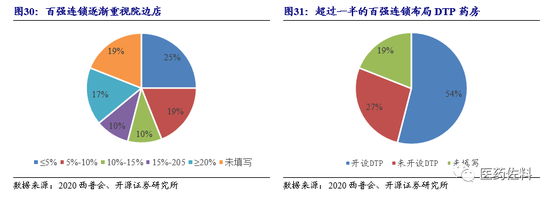 根据中康资讯,百强连锁逐渐重视院边店建设,目前院边店占比大多在10%以下,但通过调查发现院边店占比20%以上的连锁DTP药房业务发展更好,未来院边店占比呈现上升趋势。截至2020年,超过一半的百强连锁开设了DTP药房或DTP业务,且百强连锁DTP药房平均单店营业额达到2337万元/店。