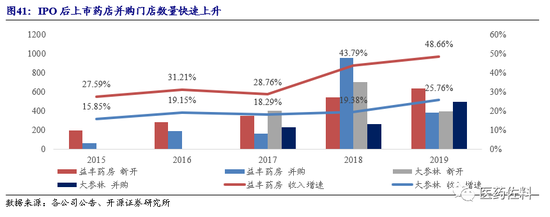 由于资金实力不断增强,各上市连锁药房自2015年逐渐加大了并购的步伐,益丰药房在2015年当年新开门店为当年并购门店数量3倍多,而后持续新增并购门店,在2017年新增并购167家,在2018年大幅增加并购门店数量,并购了959家,可以看到,益丰药房2018年收入增速从2017年的28.76%大幅提升至43.79%,并在2019年继续上升达到48.66%;大参林自2017年开始并购,其新增并购门店数量从231家增至2019年的498家,收入增速也从18.29%增至25.76%。