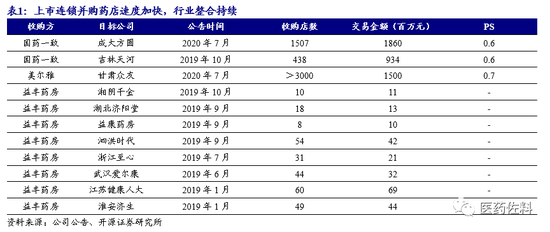 药店份额仍在加速向头部集中:2019年,药品零售市场销售额增速3.9%,2020年初受疫情影响,Q1同比增速仅为0.6%,Q2随着防疫物资供应逐步恢复正常及复工复产的需求增加,增速升温至2.8%。相比于4家上市药房Q1平均23%的收入增速,Q2平均25%的收入增速,药店份额仍在加速向头部集中。