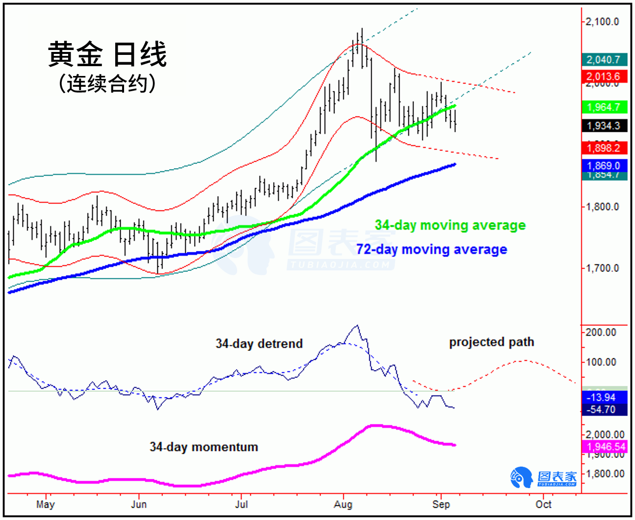 进一步来看,只要价格维持在2002.40以下,那么在下一个短期底部形成之前,价格在本周初走软的概率较大。退一步看,34天周期的下一轮上涨可能形成于9月中旬的反弹。