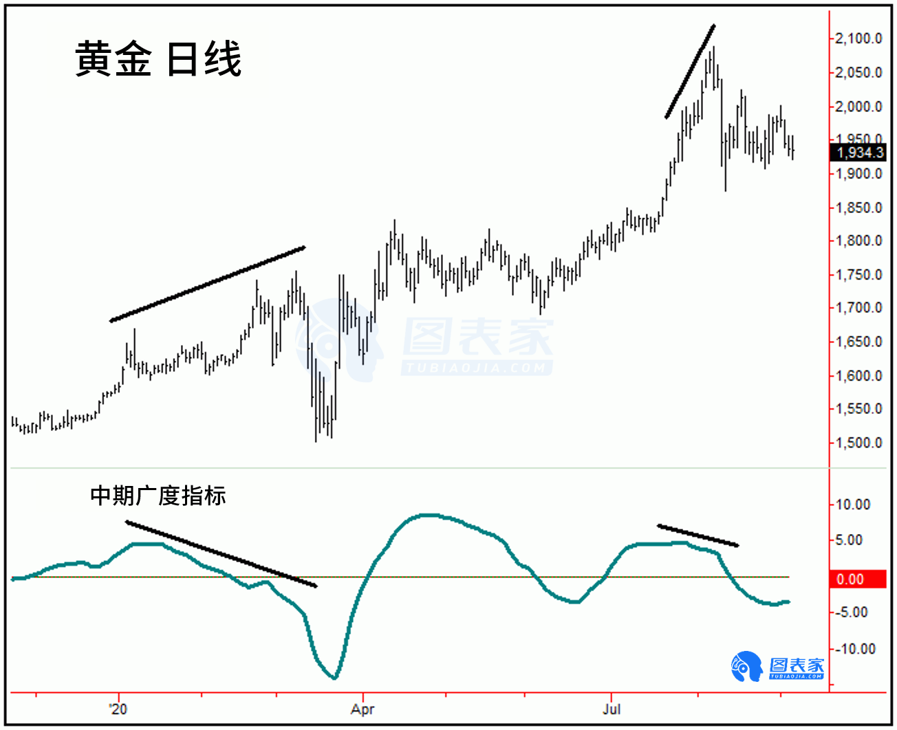 黄金的中期广度指标在7月底开始显示出与价格的背离,并由此释放酝酿大跌的警告。该指标如下图所示: