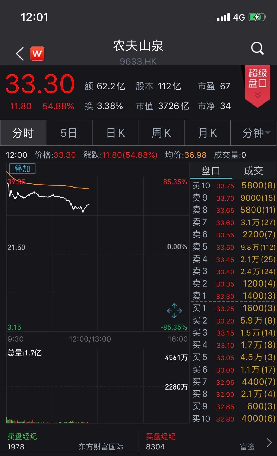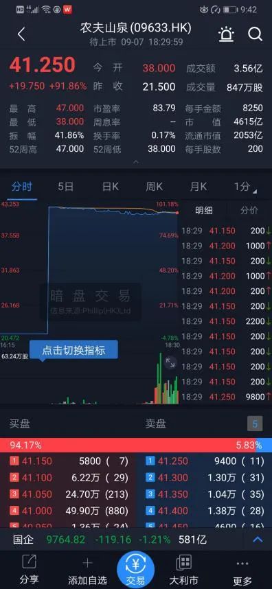 昨晚,农夫山泉的暗盘收盘大涨91.86%,股价报收41.25港元/股,总股本为111.88亿股,总市值达到了4615亿港元,超越中国石油、中国石化等知名龙头股。
