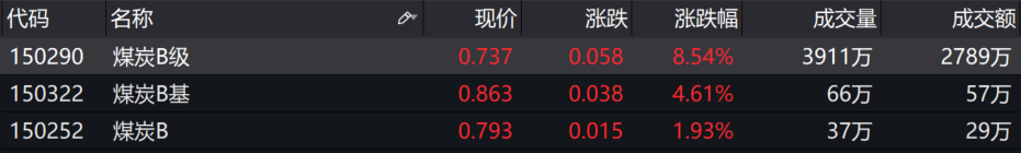 除此之外,煤炭板块午后持续走高,靖远煤电(000552.SZ)、郑州煤电(600121.SH)双双涨停,大有能源(600403.SH)、陕西煤业(601225.SH)等跟涨。申万采掘行业涨幅为2.86%,位居申万一级行业涨幅榜榜首。场内煤炭主题基金同样表现不俗,煤炭B级(150290.SZ)涨幅超过8%,煤炭B基(150322.SZ)涨幅超过4%。