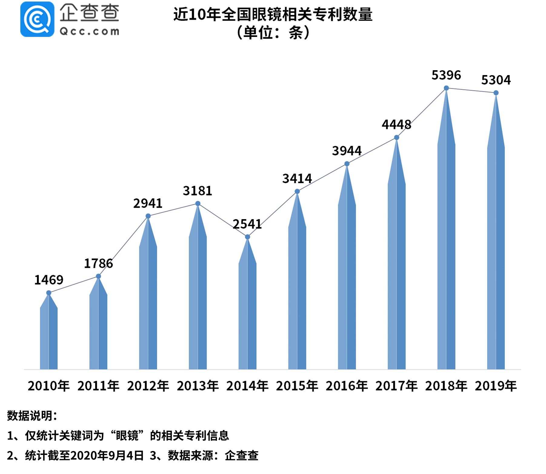 眼镜制造商一直尝试采用新技术以满足客户的需求。企查查数据显示,2010年-2018年我国眼镜相关的专利数量总体呈波动增长趋势,2018年专利数量达到近10年内最高,共5396件。而2019年,我国眼镜相关的专利数量有所下降,达5302件,较2018年下降了2%。