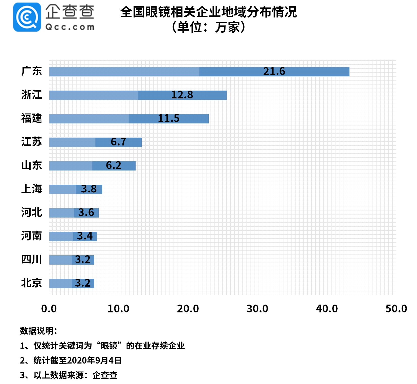 从地区分布来看,企查查数据显示,我国眼镜相关企业主要集中在沿海地区,其中广东现存的眼镜相关企业数量最多,达21.6万家,浙江、福建分别以12.8万家、11.5万家排名第二、第三。
