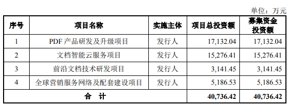 福昕软件最终募集资金净额较原计划多21.79亿元。福昕软件9月3日发布的招股说明书显示,公司计划募集资金4.07亿元,分别用于PDF产品研发及升级项目、文档智能云服务项目、前沿文档技术研发项目、全球营销服务网络及配套建设项目。