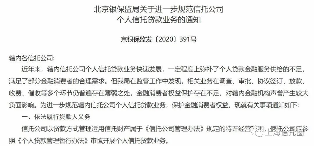 9月8日,北京银保监局印发《关于进一步规范信托公司个人信托贷款业务的通知》,针对当前部分信托公司在个人信托贷款业务调查、审批、协议签订、放款、收费、催收等多个环节存在的突出问题明确监管要求。《通知》要求建立并执行贷款面谈制度。