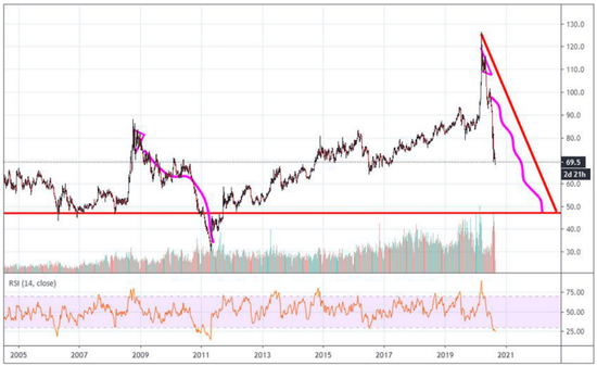 我们认为,目前黄金和白银的走势类似于1999年峰值之后2000~2005年的初始冲动式波动(以浅蓝色突出显示)。随着贵金属涨势加速,当市场接近峰值(红色突出显示)时,这一冲动性走势建立了一个更大、更积极的下行价格趋势。这些激进的波动通常是正常贵金属价格区间的2倍至3倍(或更多),而且在性质上可能非常具有爆炸性。如果我们的分析是正确的,那么到2020年底,以及未来2到3年多的时间里,因为目前标普500指数/黄金比率模式的走势,我们可能会进入贵金属价格的爆炸性阶段。
