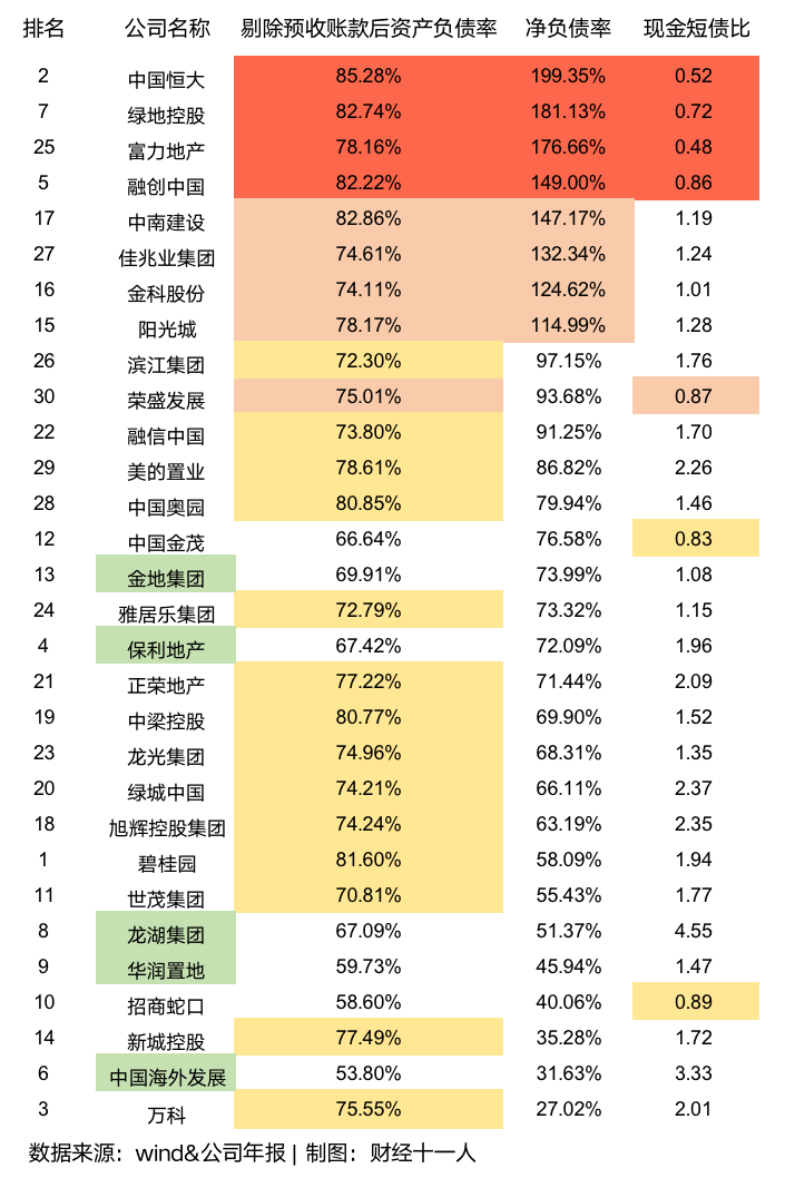 但是,从不易利用“会计手段”调节的资产负债率(剔除预收账款)来看,大部分房企,表现不佳。
