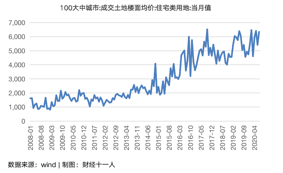 根据房地产销售的经营周期,2020年上半年结算的住宅项目大多是在2016年下半年及2017年获取的土地。从下图可以看到,彼时百城成交土地溢价率均处于高位。