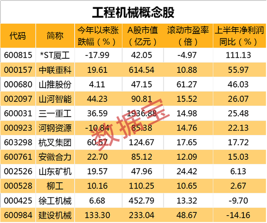 *ST厦工、河钢资源等股的股价年内呈现负增长,*ST厦工今年上半年净利润0.31亿元,同比增长111.13%,实现扭亏为赢。公司是国家重点生产装载机、挖掘机、叉车等产品的骨干大型一类企业,是当今中国最大的工程机械制造基地之一,是作为中国人民解放军总装备部、总后勤部、武警总队、驻港澳部队、维和部队的军品承制单位。