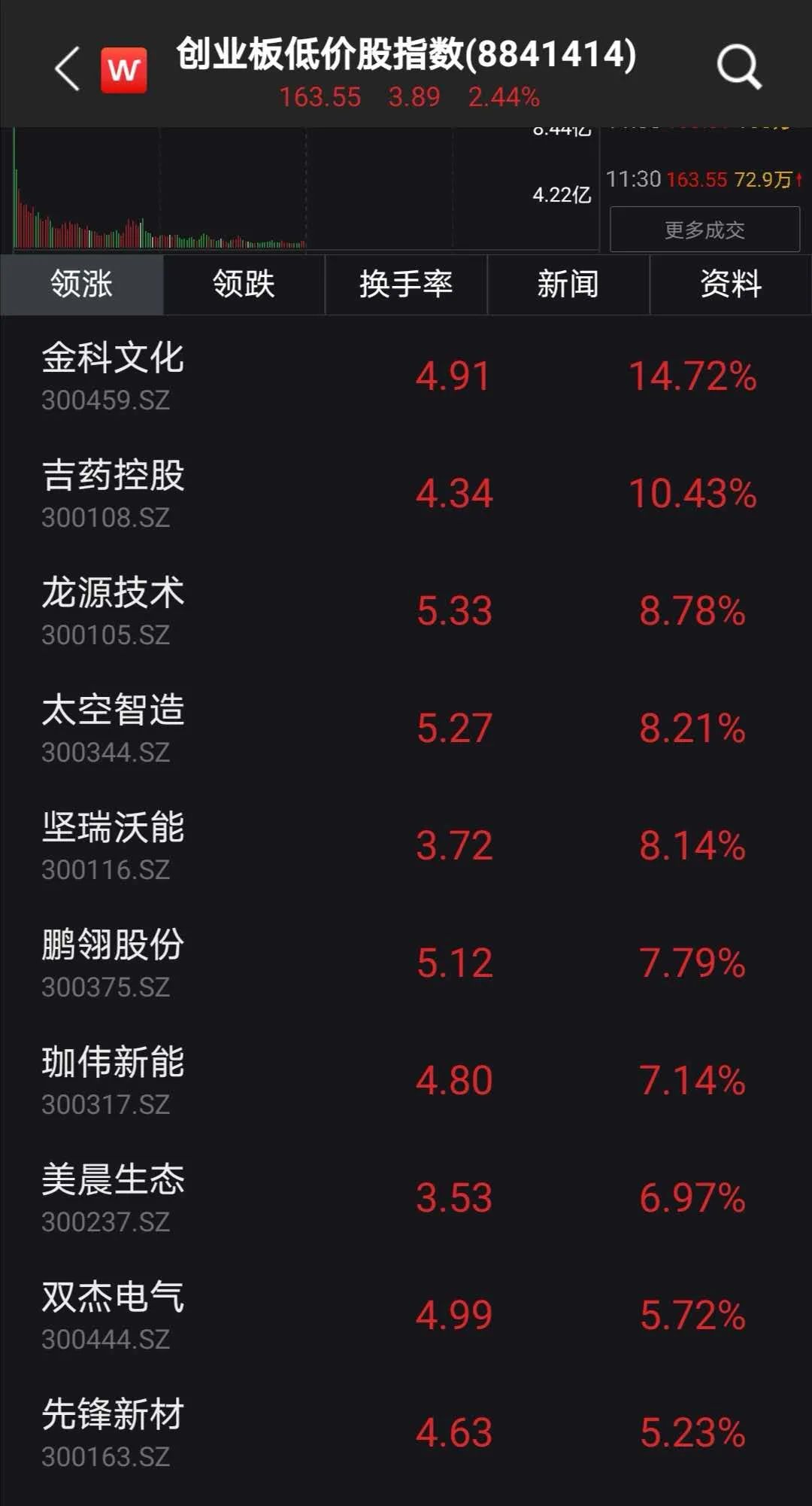 上午,创业板低价股指数涨超2%,盘初一度跌超3%,坚瑞沃能、金科文化、吉药控股(维权)等涨超7%。