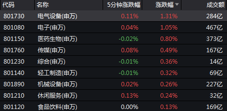 从行业板块情况来看,申万一级28个行业中,电气设备、电子板块涨幅居前,涨幅均超1%;医药生物、传媒、轻工制造等板块的涨幅紧随其后;国防军工、采掘板块、农林牧渔等板块则跌幅居前。
