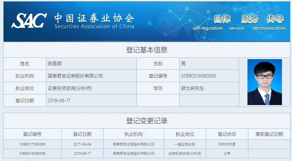 按照证监会的要求,分析师必须在券商从业两年后才能取得证券分析师资格,此后才可以独立署名发表研究报告,在此之前可以联合署名。中国证券业协会数据显示,陈显顺证券投资咨询(分析师)执业岗位的登记日期为2019年8月17日,距今也只有一年多的时间。
