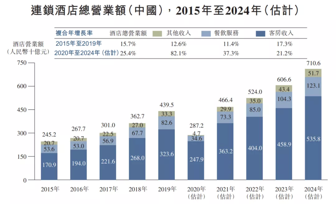 3、招股书披露:由于中国酒店业的此一结构性变动,中档及高档连锁酒店的客房数量自2015年至2019年录得双位数增长,复合年增长率分别为34.3%及13.6%。同时预测,中档连锁酒店的客房数目将以18.9%的复合年增长率由2020年增长至2024年。7分