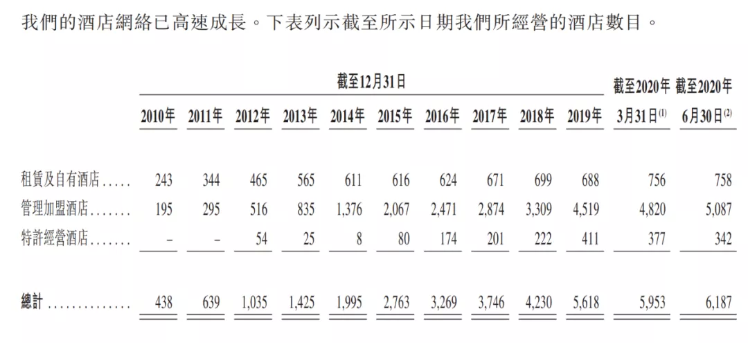 截至2020年6月30日,华住集团拥有6,187家在营酒店,及正在另外开发2,375家新酒店,包括54家租赁或自有酒店以及2,321家管理加盟及特许经营酒店。