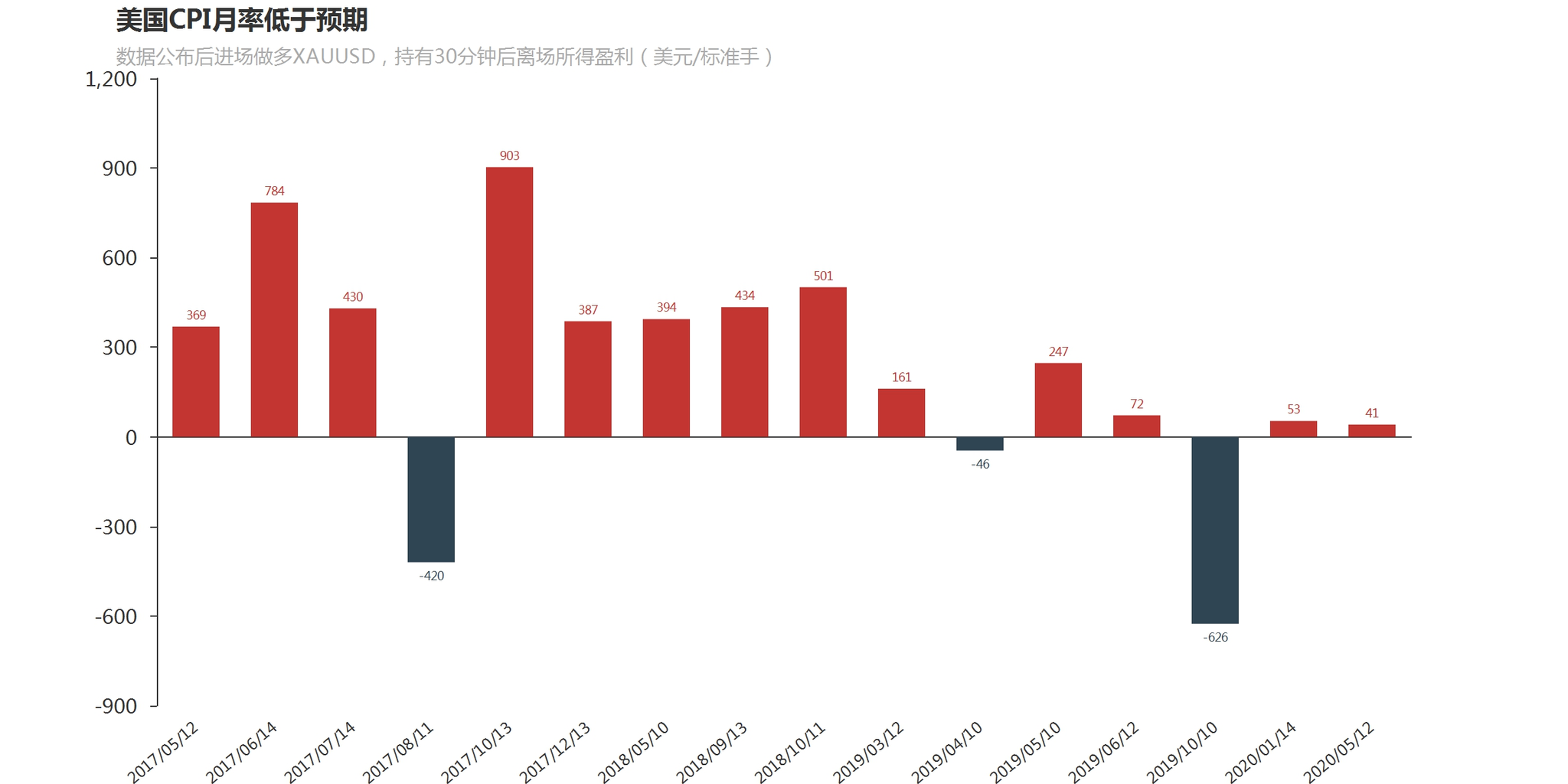 策略三:低于预期,数据公布后即刻进场做多XAUUSD,持有30分钟后离场。