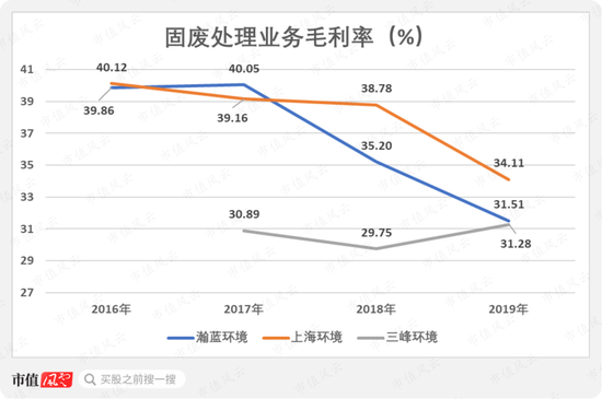 上海环境和瀚蓝环境的毛利率近年来出现明显下滑,从2016年的约40%,下滑至2019年的30-35%区间。瀚蓝环境2019年的毛利率已经与三峰环境非常接近,上海环境的表现更好,为34.11%。