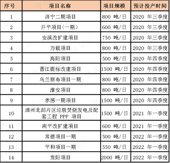 截止2020年6月末,公司在建生活垃圾焚烧发电项目为14个,其中11个项目预计投产时间集中在2020年三季度至2021年一季度,在建规模为1.32万吨/日。