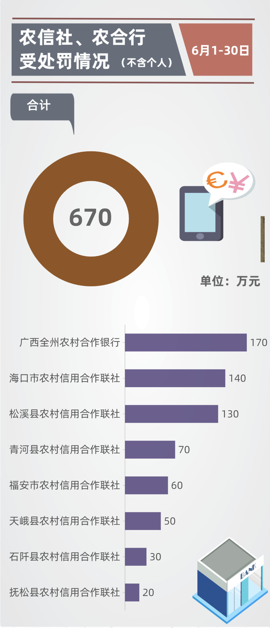 广西全州农村合作银行、海口市农村信用合作联社和松溪县农村信用合作联社以170万元、140万元和130万元罚款排在农信社、农合行前三。