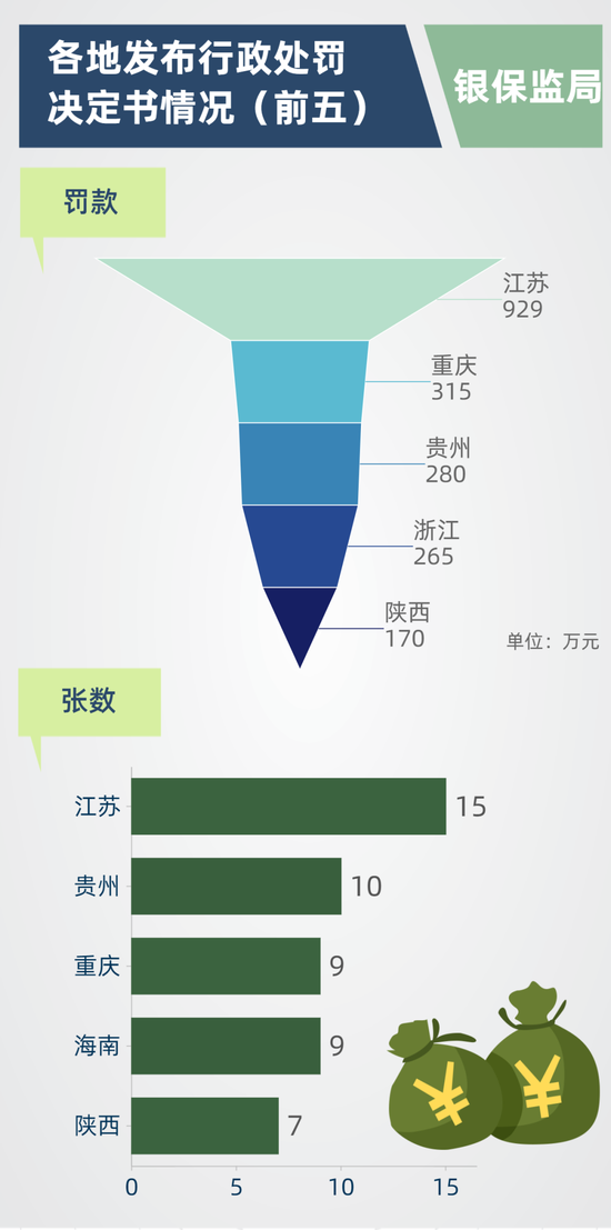 在银保监局方面,江苏以15张行政处罚决定书位列第一,贵州、重庆以10张、9张排在二三位。江苏以929万元罚款排在第一,重庆、贵州以315万元、280万元排在二三位。