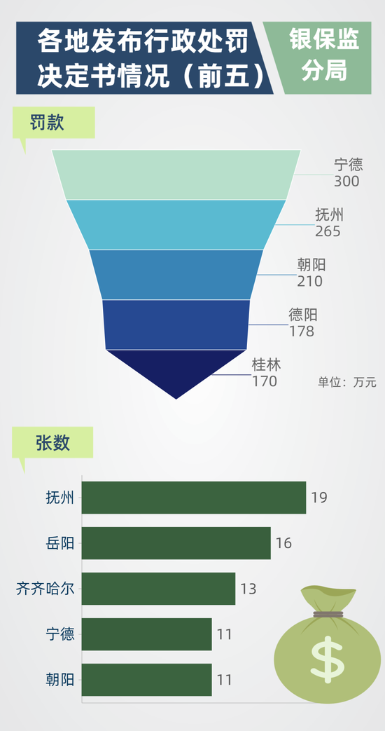 在银保监分局方面,抚州以19张行政处罚决定书排第一,岳阳、齐齐哈尔以16张、13张排在二三位。宁德以300万元罚款排在第一,抚州、朝阳以265万元、210万元排在二三位。