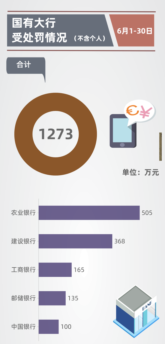 农业银行、建设银行和工商银行以505万元、368万元和165万元的罚款排在国有大行前三。