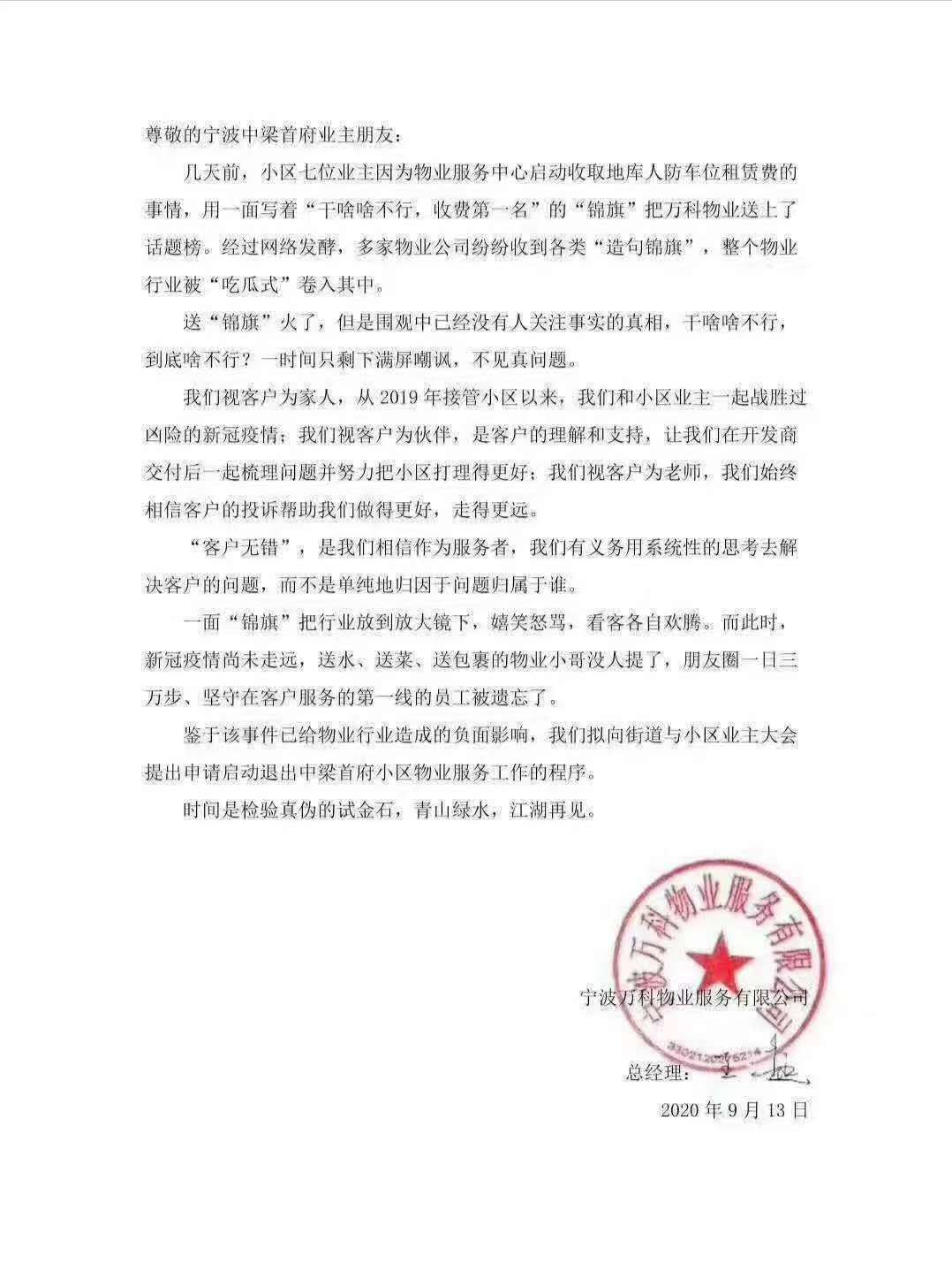 9月13日,宁波万科物业对宁波中梁首府业主发出一封撤场公开信,表示“拟向街道与小区业主大会提出申请启动退出中梁首府小区物业服务工作的程序”。