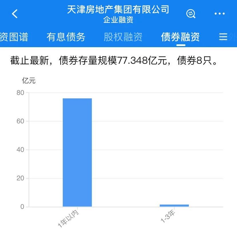 企业预警通显示,目前天房集团一共存续8只债券,存量规模为77.35亿元,其中75.95亿元将于一年内到期,1.4亿元将于2023年4月到期。