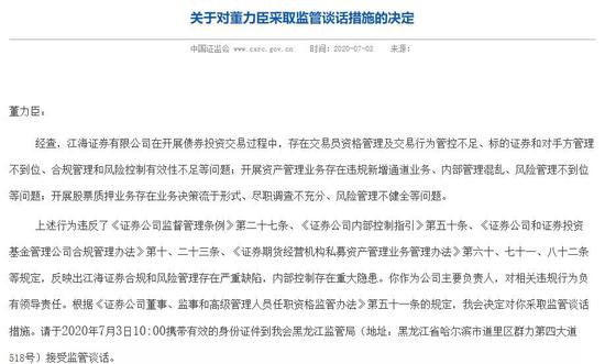 值得注意的是,证监会官网显示,在此之前的7月,董力臣作为江海证券主要负责人,对公司前述相关违规行为负有领导责任,其已经被证监会采取监管谈话措施。