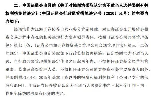 按照相关规定,证监会决定认定饶晞浩为不适当人选,自行政监督管理措施决定作出之日起两年内,不得担任证券基金经营机构董事、监事及高级管理人员,不得担任证券公司债券投资业务主要负责人职务,并限制领取2018、2019年基本工资以外的报酬和福利等权利(公司已支付的部分应退回)。