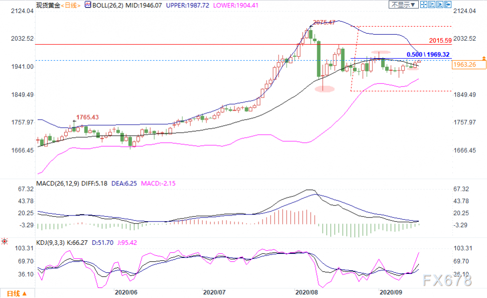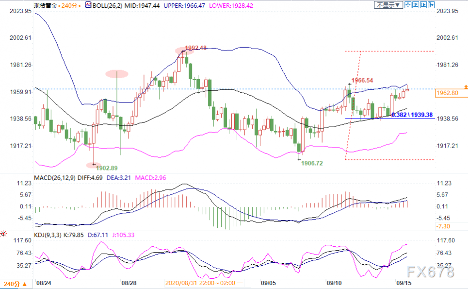 上行方面,先上看2075.47-1863.16这波跌势的50%回撤位1969.32附近,进一步阻力看向9月1日高点1992.48。强阻力上看布林带上轨2000关口,这是重要的心理关口,预计金价短期仍将在该关口受到压制。而一旦价格突破,将再度提振看多情绪,有利价格上测8月18日高点2015.59。
