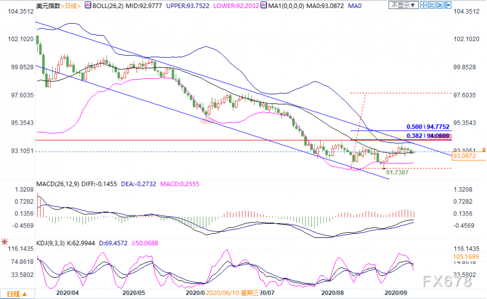 上行阻力,先留意布林带中轨93.21;进一步阻力为上看布林带上轨93.53,这与8月21日高点相近,参考性较强。强阻力上看8月3日高点94.00,该位置有明显压制性。此外,9月9日高点93.66投资者也需保持留意。