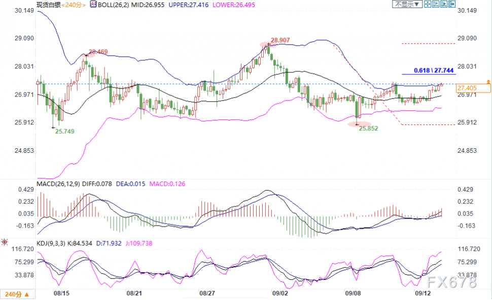 震荡;银价盘中走高,逼近布林带上轨,MACD金叉、红柱动能小幅增加,KDJ金叉、指数位于70附近。技术面来看,银价短线料震荡走高。